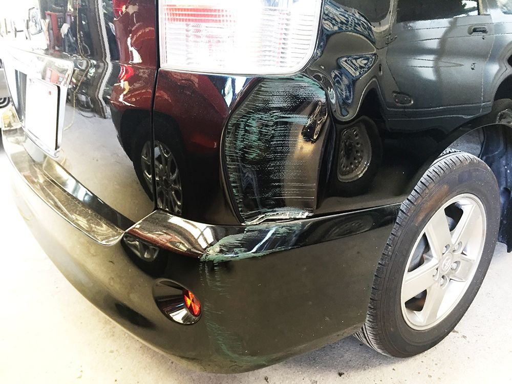 ここまでの凹みの場合は、通常だとクオーターは交換、バンパーは鈑金になります。